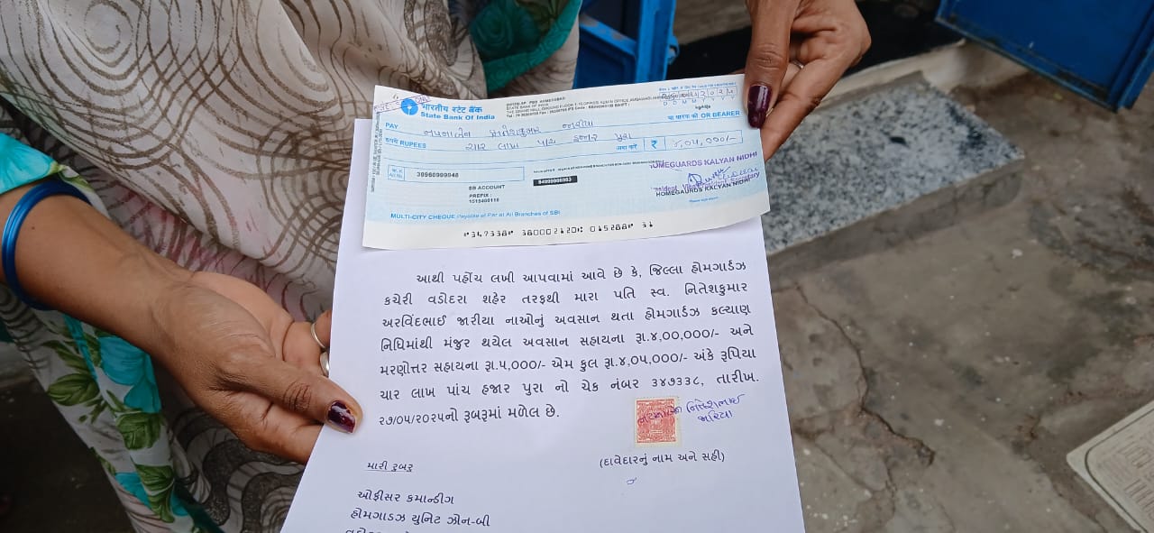 વડોદરા : શહેરમાં લક્ષ્મીપુરા ગામ ખાતે રહેતા સ્વ. નિતેશ અરવિંદ જારીયા ફરજ દરમિયાન મૃત્યુ પામેલા હોમગાર્ડ જવાનના પરિવારને રૂપિયા 4.05 લાખ નો ચેક અર્પણ કરવામાં આવ્યો હતો.