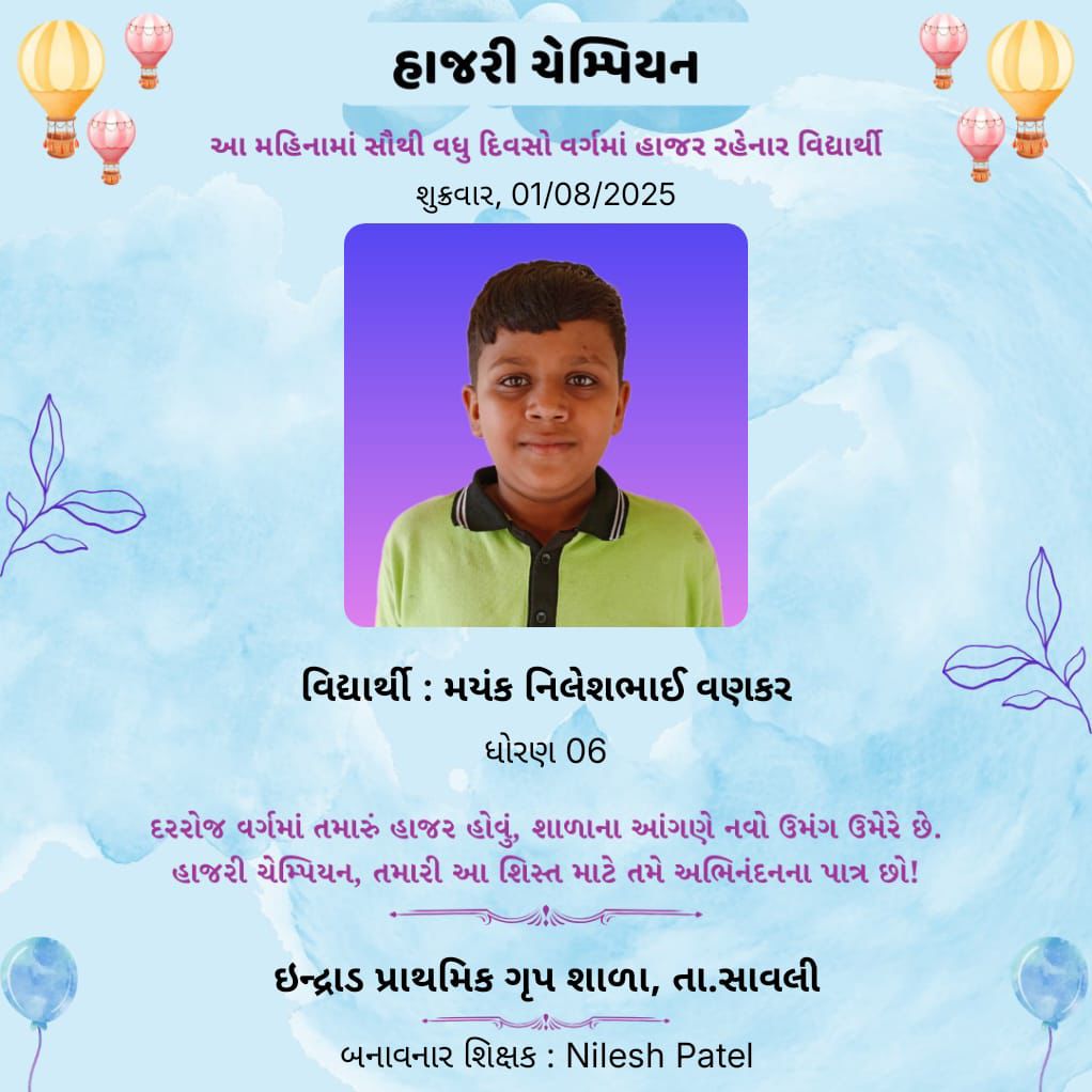 વડોદરા જિલ્લાના સાવલી તાલુકાના ઇન્દ્રાળ ગામના બાળકોમાં શિક્ષણ પ્રત્યે રુચિ વધારવા માટે એક પ્રેરણાદાયી પહેલ શરૂ કરી છે. આ પરિવર્તનનાં સૂત્રધાર છે ગામનાં યુવા અને શિક્ષિત સરપંચ, ડૉ. જૈમિનિ જયસ્વાલ. શિક્ષણ જ કોઈપણ સમાજનો સાચો પાયો છે તેને કેન્દ્રમાં રાખીને તેમણે તેમના ગામની શાળાના હાજરી ચેમ્પિયન' નામની નવી પહેલ શરૂ કરી છે.આ સંકલ્પને સાકાર કરવા માટે તેમણે એક અનોખો અને પ્રેરણાદાયક પ્રયોગ શરૂ કર્યો. તેમણે 'શાળાના હાજરી ચેમ્પિયન' નામની એક પહેલ શરૂ કરી.