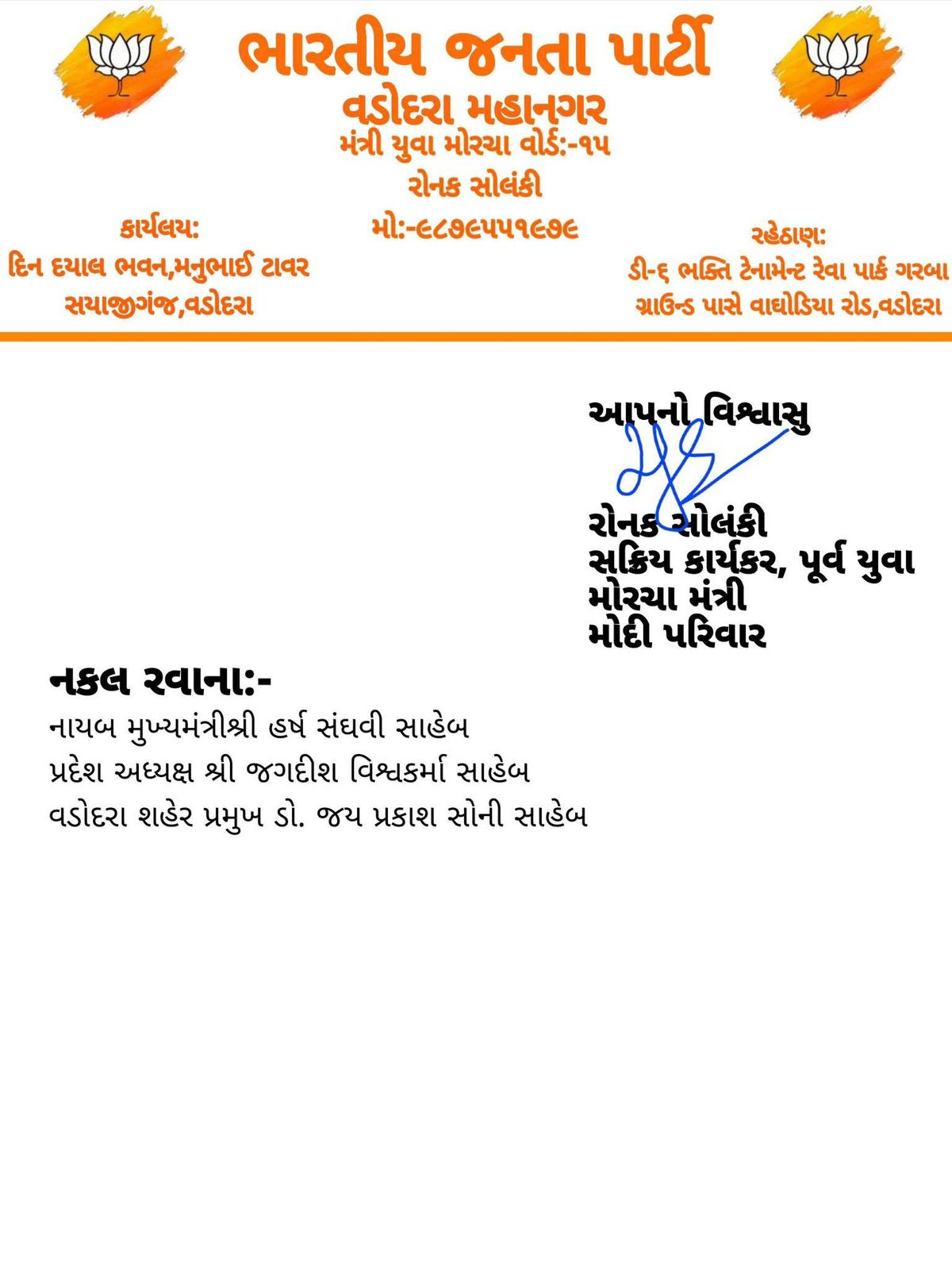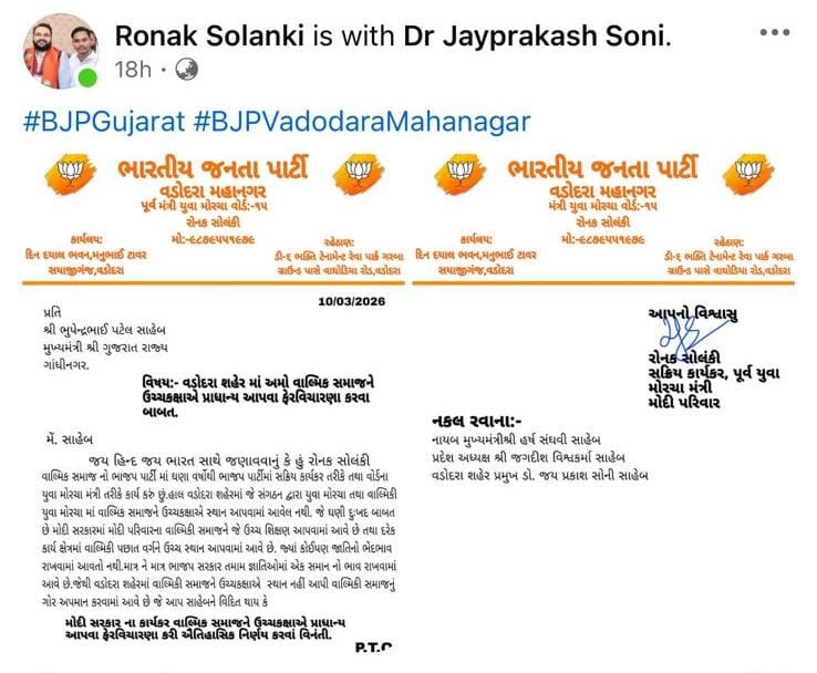 વાલ્મિકી સમાજને ઉચ્ચ સ્થાન ન મળતા યુવા નેતા રોનક સોલંકીનો પત્ર.