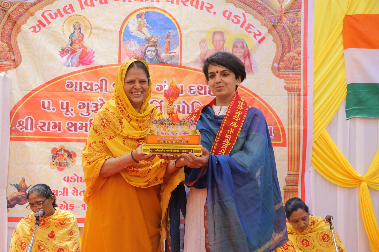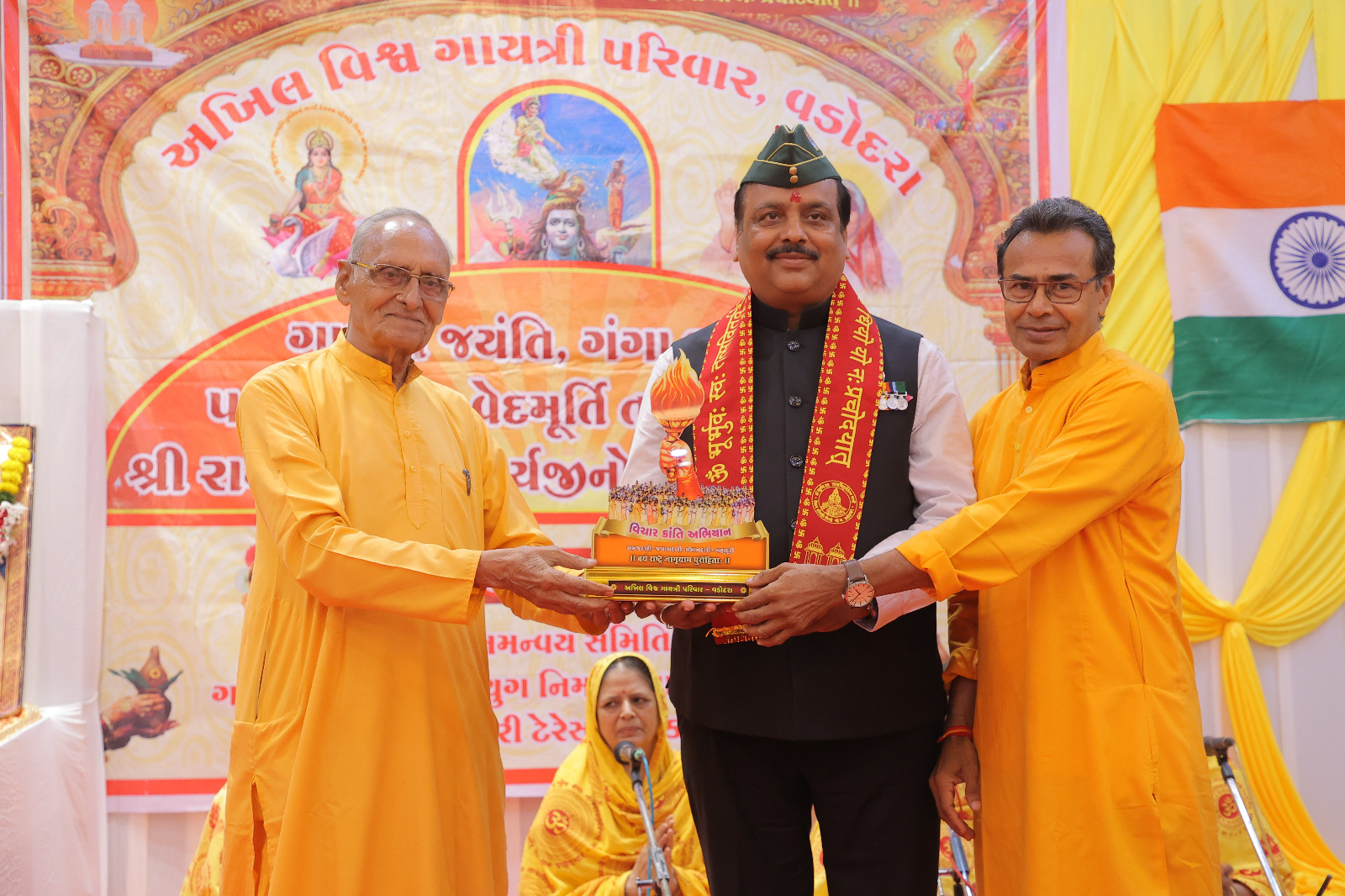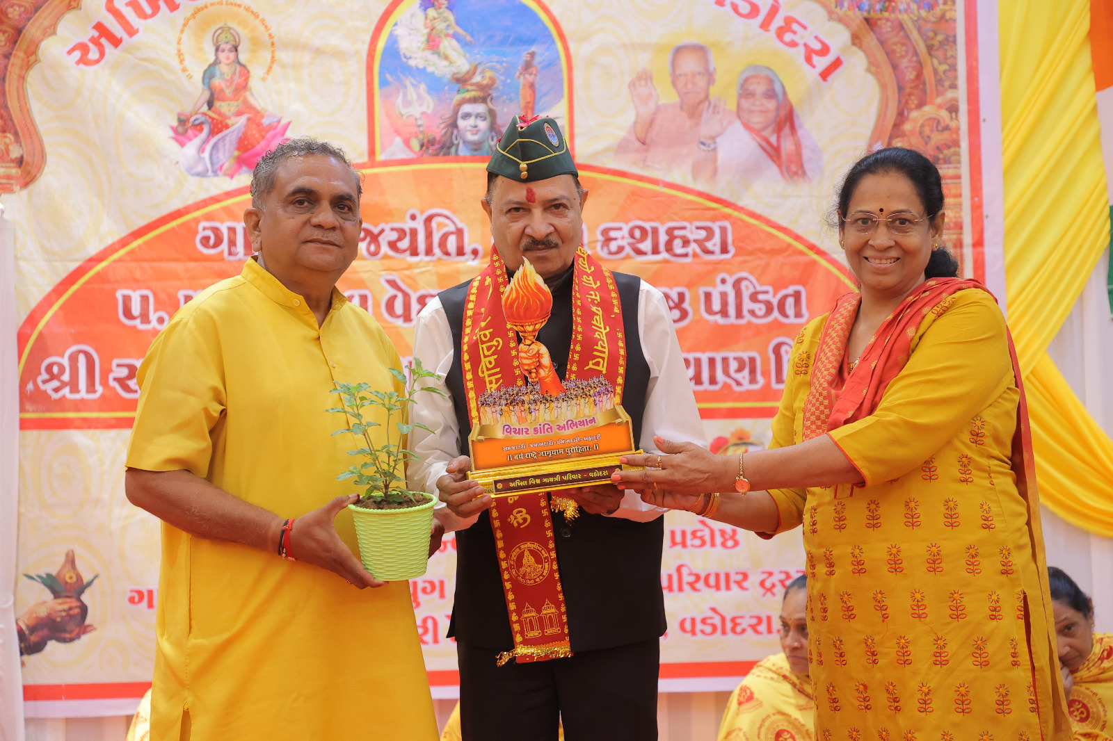 ગાયત્રી પરિવાર વડોદરા દ્વારા તેઓ નુ અંત્યત ભાવમય સ્વાગત કરતા " મશાલ" મોમેન્ટો ગાયત્રી મંત્ર ખેસ સતસાહિત્ય સાથે તુલસી નો છોડ અર્પણ કરેલ