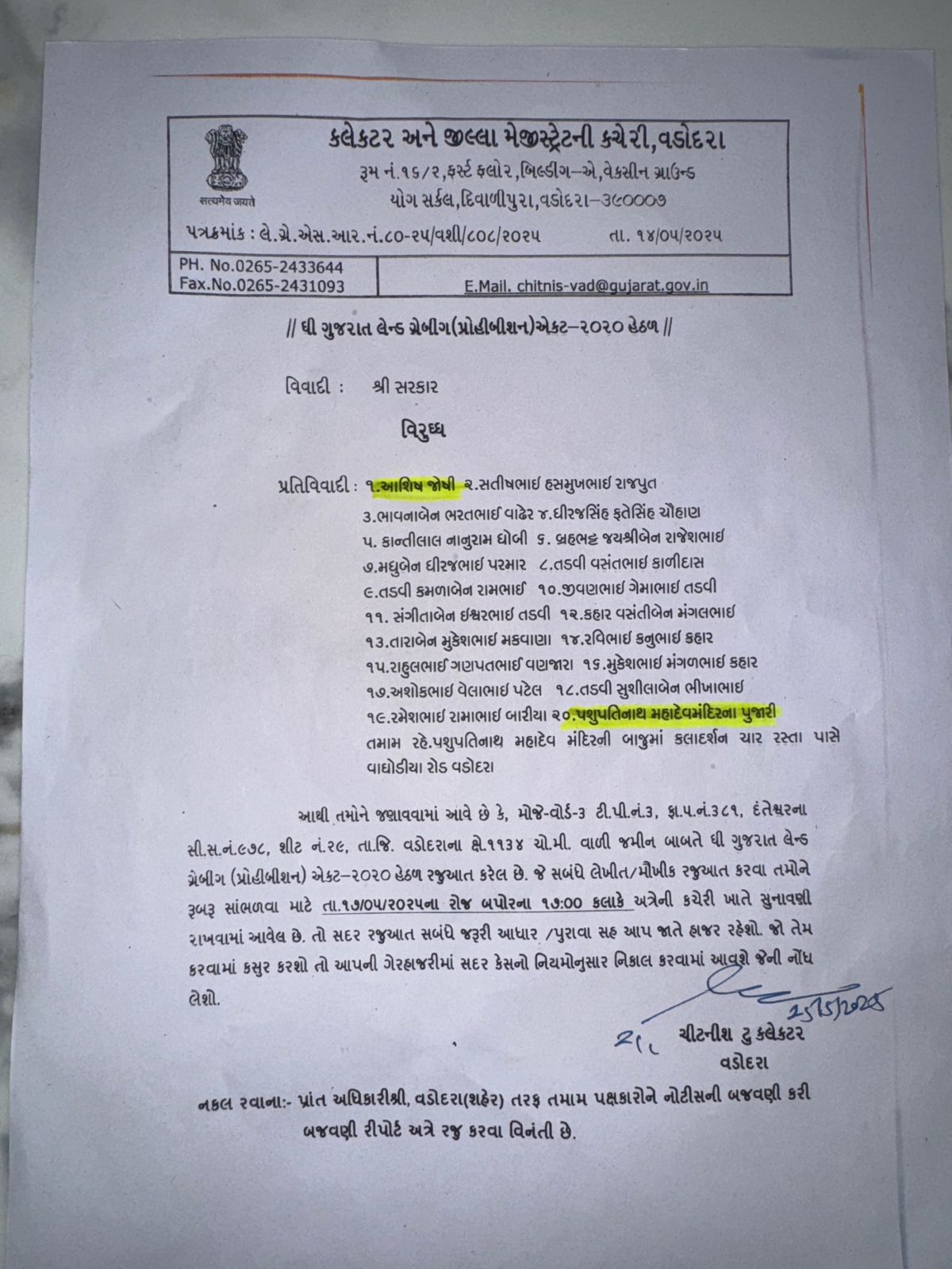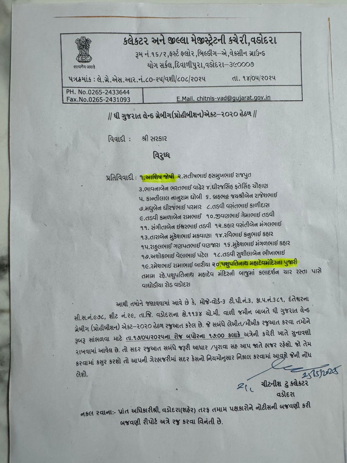 શહેરના વાઘોડીયા રોડ કલાદર્શન ચાર રસ્તા પાસે રતિલાલ પાર્કમાં રહેતા કોર્પોરેટર આશિષ જોશીનો ગુનો માત્ર એટલો જ છે કે તે સત્ય બોલી રહ્યા છે અને સાચુ બોલવાની કિંમત તેમને ચુકવવી પડી છે. હરણી બોટકાંડના પીડિતોને ન્યાય મળે તે માટે શરુઆતથી જ અવાજ ઉઠાવનારા કોર્પોરેટર આશિષ જોશીને કોઇ પણ ભોગે દબાવવા માટે હવે સરકારી તંત્રનો સહારો લેવાયો છે. ભાજપના નેતાઓએ હવે કલેક્ટર દ્વારા આશિષ જોશીને લેન્ડ ગ્રેબીંગના કેસમાં ફસાવાનો કારસો રચાયો છે. આશિષ જોશીના ઘરની પાસે જ પ્લોટ આવેલો છે. જ્યાં કેટલાક ઝુંપડા છે અને પશુપતિનાથનું મંદિર છે. હવે કલેક્ટરે આશિશ જોશી સાથે ત્યાં રહેતા 20 લોકોને નોટિસ આપી છે કે આ જમીન બાબતે લેન્ડ ગ્રેબીંગ એક્ટ હેઠળ રજૂઆત મળેલી છે. તે સંદર્ભે તમે 17 તારીખે કલેક્ટર કચેરીએ આવશો. મોજે વોર્ડ નંબર 3 ટીપી નંબર 3માં આવેલા ફાઇલ પ્લોટ અંગે આ નોટિસ આશિષ જોશીને અપાઇ છે. કોર્પોરેટર આશિષ જોશીએ કહ્યું કે મારી બાજુમાં વર્ષોથી સરકારી પ્લોટ છે. ત્યાં કોઇ દબાણ નથી. ત્યાં ઝુંપડા અને મહાદેવનું મંદિર 23 વર્ષથી છે. ઝુંપડા 60 વર્ષથી છે. પહેલા શોધાયું કે આશિષ જોશી સામે લેન્ડ ગ્રેબીંગ કેસ કરીએ એટલે ગયા અઠવાડીયે કોણ ભાડુ ઉઘરાવે છે. તે સહિતની બાબતોની તપાસ કરાઇ તો સ્થાનિકએ કહ્યું કે કોર્પોરેશને આપેલું છે જેથી હવે બધા પર લેન્ડ ગ્રેબીંગનો ગુનો દાખલ કર્યો છે અને નોટિસ આપી છે. 17 તારીખે કલેક્ટરમાં બોલાવ્યા છે.