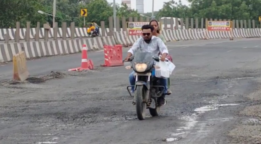 વડોદરાના છેવાડે આવેલા છાણી સોખડા દુમાડ બ્રિજ પર પાણીની લાઇનમાં લીકેજ. લીકેજને કારણે બ્રિજ પર પડી ગયા છે કમ્મર તોડ ખાડા.