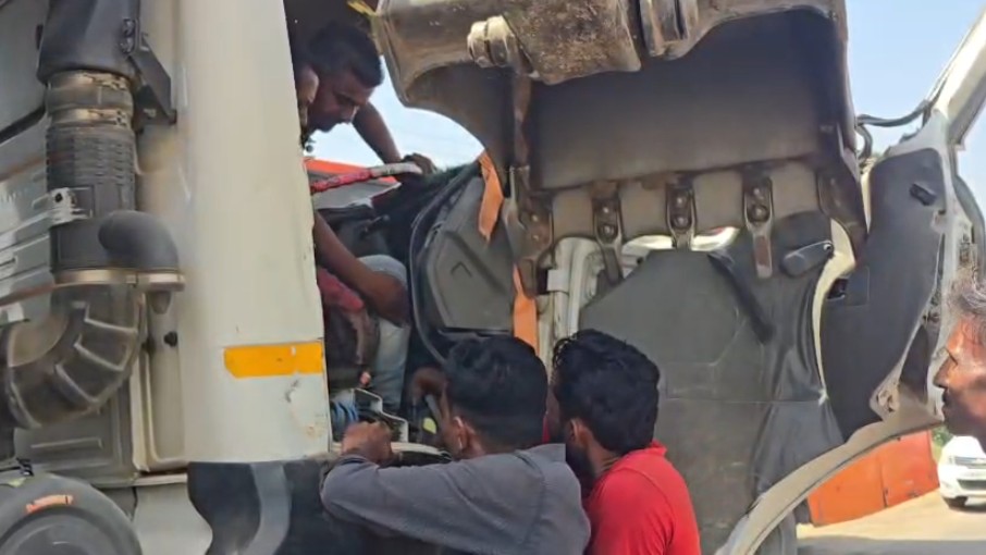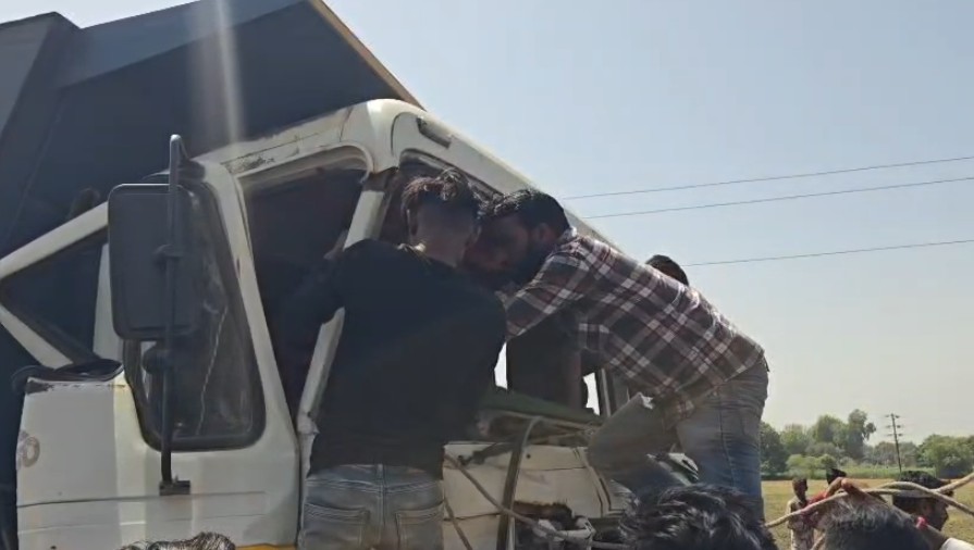 બે ટ્રકો સામસામે ભટકાતા ડમ્પર ચાલક કેબીનમાં ફસાયો. સ્થાનિકો એ કેબીનમાં ફરાયેલ ચાલકને બહાર કાઢવા પ્રયત્ન હાથ ધર્યા. મદદ માટે જેસીબી મશીન બોલાવાયું. જેસીબી દ્વ્રારા ડમ્પરચાલકનો ફસાયેલ પગ બહાર કાઢી રેસ્ક્યુ કરાયું. ડમ્પર ચાલકને હેમખેમ રેસ્ક્યુ કરાયો ઘટનાને પગલે ટ્રાફીક જામના દ્રશ્યો સહિત અફરાતફરીનો માહોલ સર્જાયો.