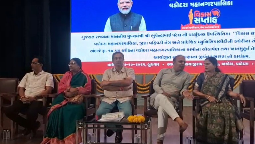 રાજ્યભરમાં ઉજવાઈ રહેલા વિકાસ સપ્તાહ અંતર્ગત આજે વડોદરા મ.ન.પા. દ્વારા 17.55 કરોડના વિકાસના કામોનું લોકાર્પણ કરવામાં આવ્યું જેમાં રાજ્યના મુખ્યમંત્રી ભુપેન્દ્ર પટેલ વર્ચ્યુઅલી જોડાયા હતા.જેનું જીવંત પ્રસારણ સર સયાજીરાવ નગર સભાગૃહ ખાતે નિહાળવાનું આયોજન કરવામાં આવ્યું.