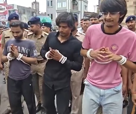 શ્રીજીની સવારી પર ઈંડા ફેંકનાર ચાર આરોપીઓને પોલીસ કાળા કાચવાળી એ.સી સ્વીફ્ટ કારમાં કોર્ટમાં લાવી